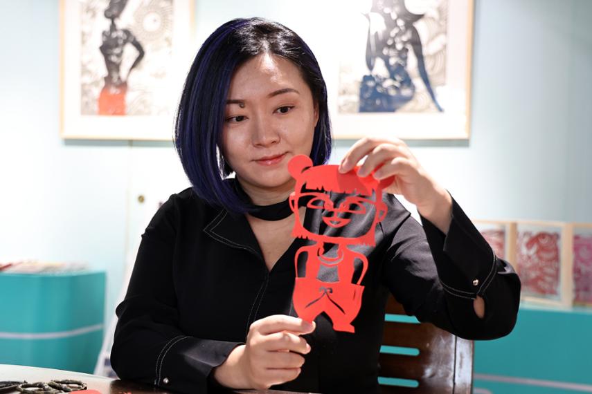在田子坊“守白艺术”的展厅里,记者见到了染着蓝色头发的“90后”女生李诗忆,和人们印象中的非遗传承人不同的是,李诗忆毕业于伦敦威斯敏斯特大学,是博物馆、画廊与当代文化研究专业硕士。同时,她又来自于一个传统手工艺人的家庭,父亲李守白是海派剪纸的第三代传承人。接受采访时,李诗忆谈及自己的艺术创作道路,其实就是从孩童时期的玩耍开始。