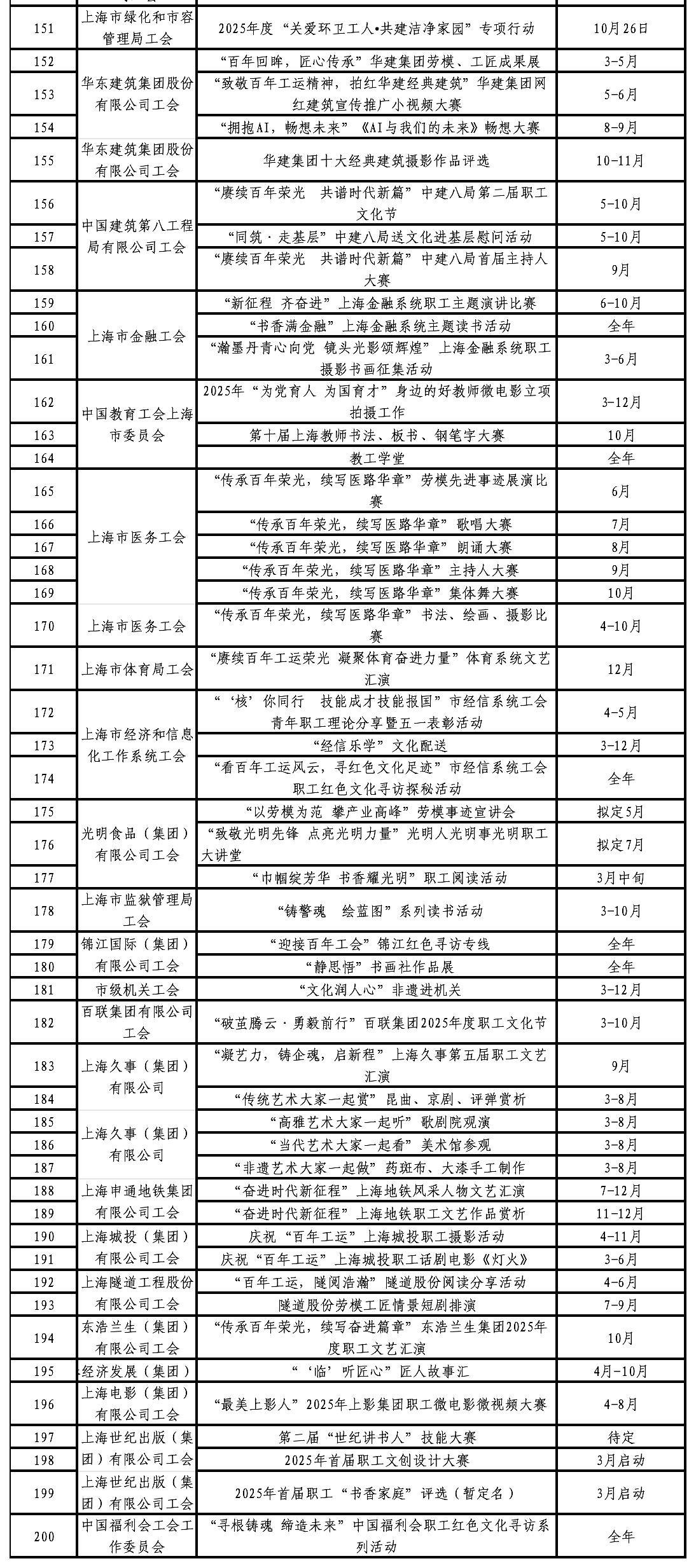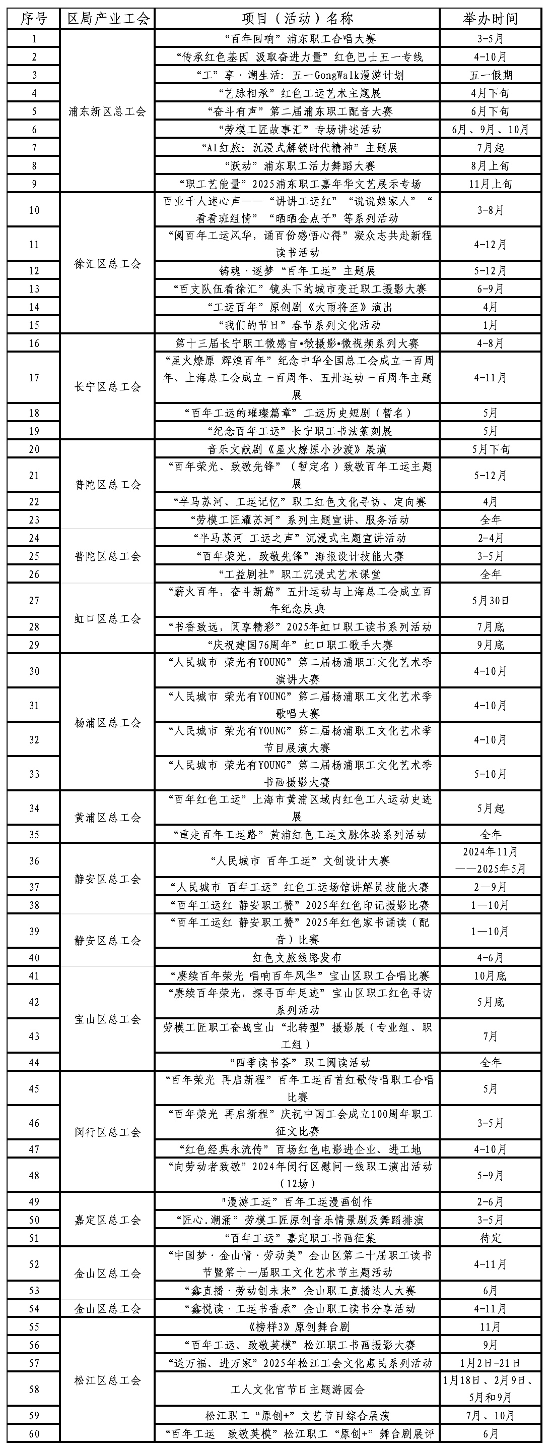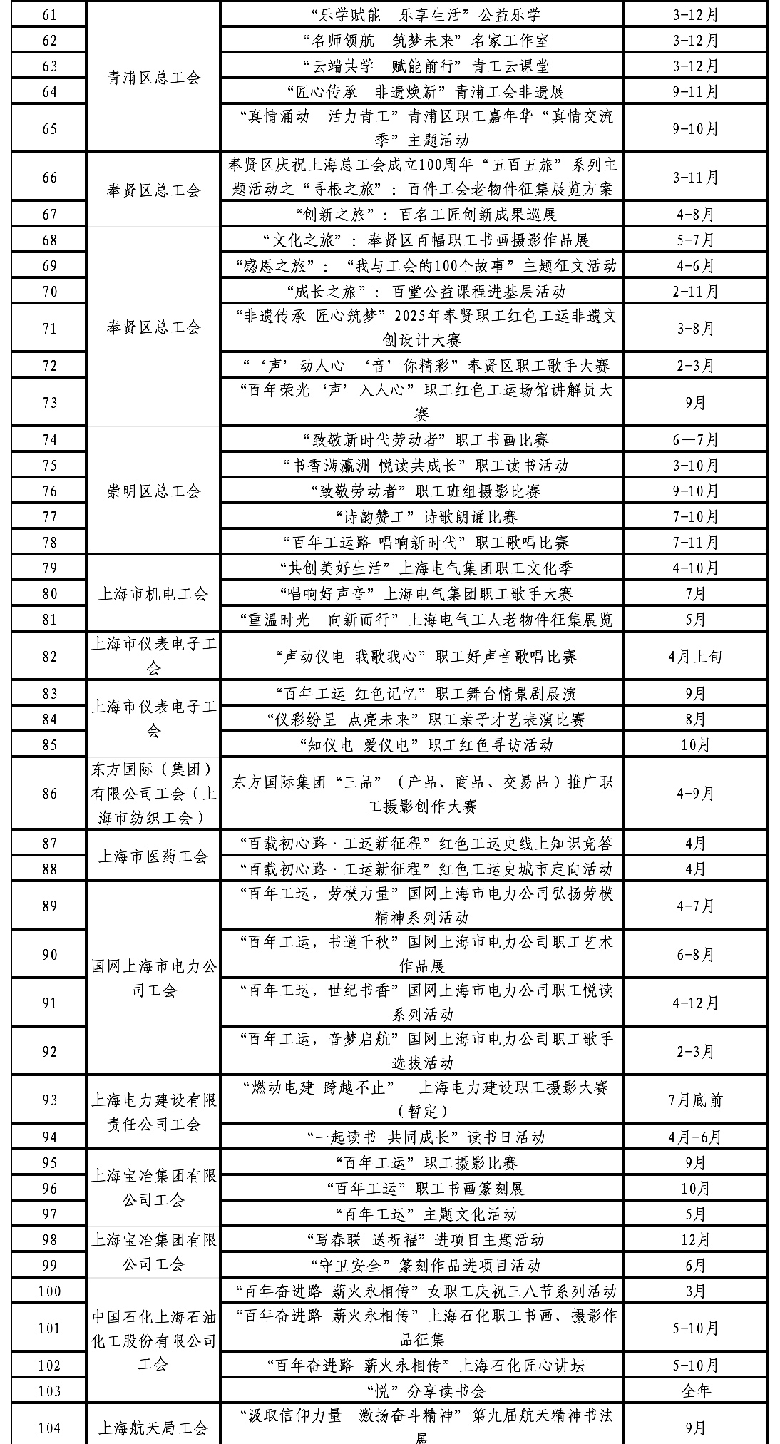 2025年是中华全国总工会和上海总工会成立100周年。第三届上海职工文化季将紧扣“赓续百年工会荣光,谱写新时代新篇章”,围绕职工文化需求新趋势,推出十项市级活动项目,持续打造可观可感、可亲可近、有生命力有影响力的职工文化品牌,推动职工文化品牌与城市脉动同频共振,为上海建设习近平文化思想最佳实践地注入工会力量。