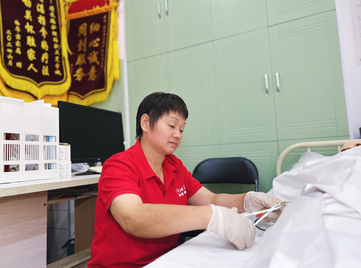 7月15日,记者前往清长腾护理站采访殷琴时,她正在一张护理床旁练习相关护理技能。下周,她就将参加家庭照护员(三级/高级工)的考试。“正是这一次考前培训,让我系统学习了安宁照护中有关遗物整理相关的内容,没想到这么快就用上了!”