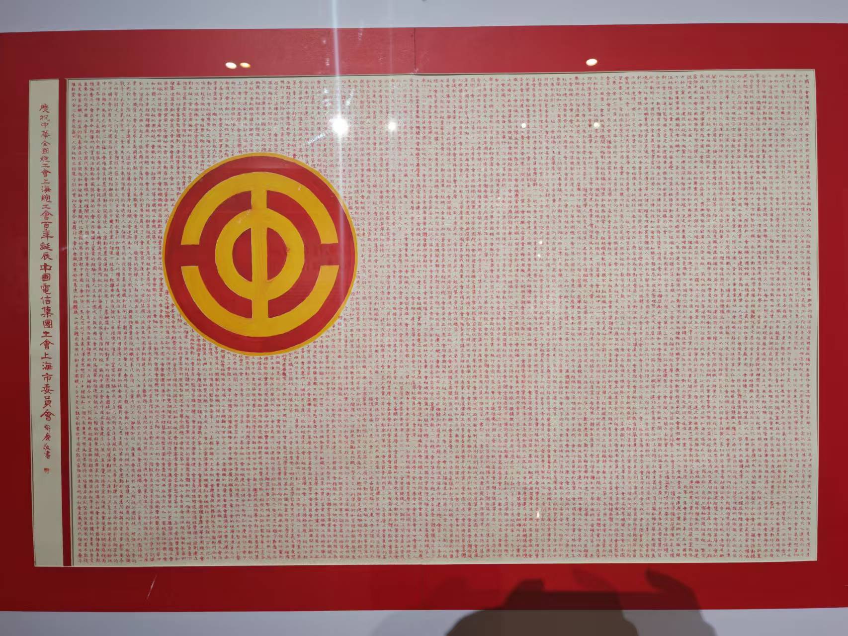 在一张60厘米宽、1米2长的宣纸上,1万多个繁体隶书小字整齐排布,字体之小,约莫5毫米;字体之正,仿佛刻板印刷。这是来自上海电信的一位退休职工——郁庆——历时两个月、亲手书写的《中国工会章程》书法作品。