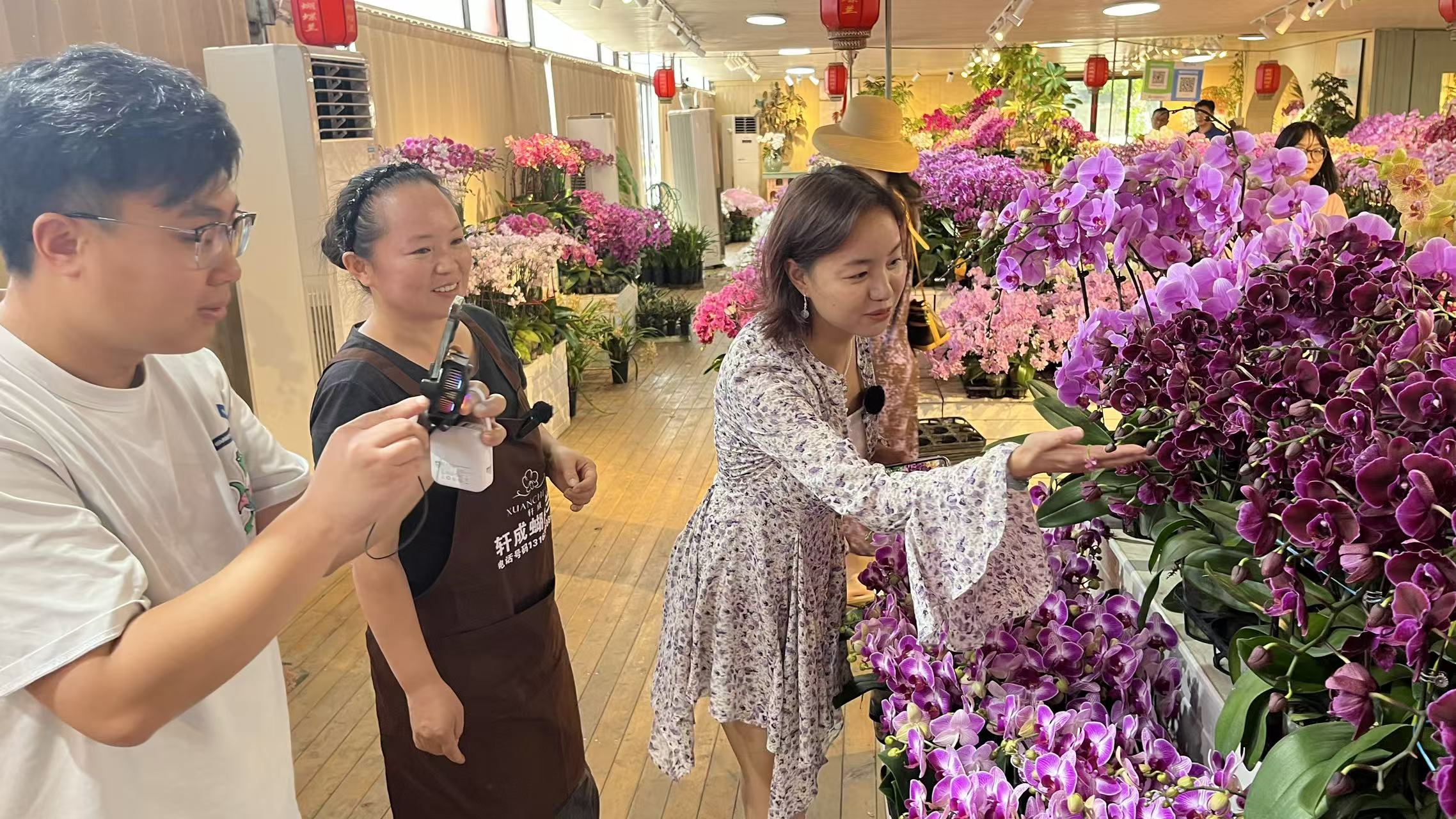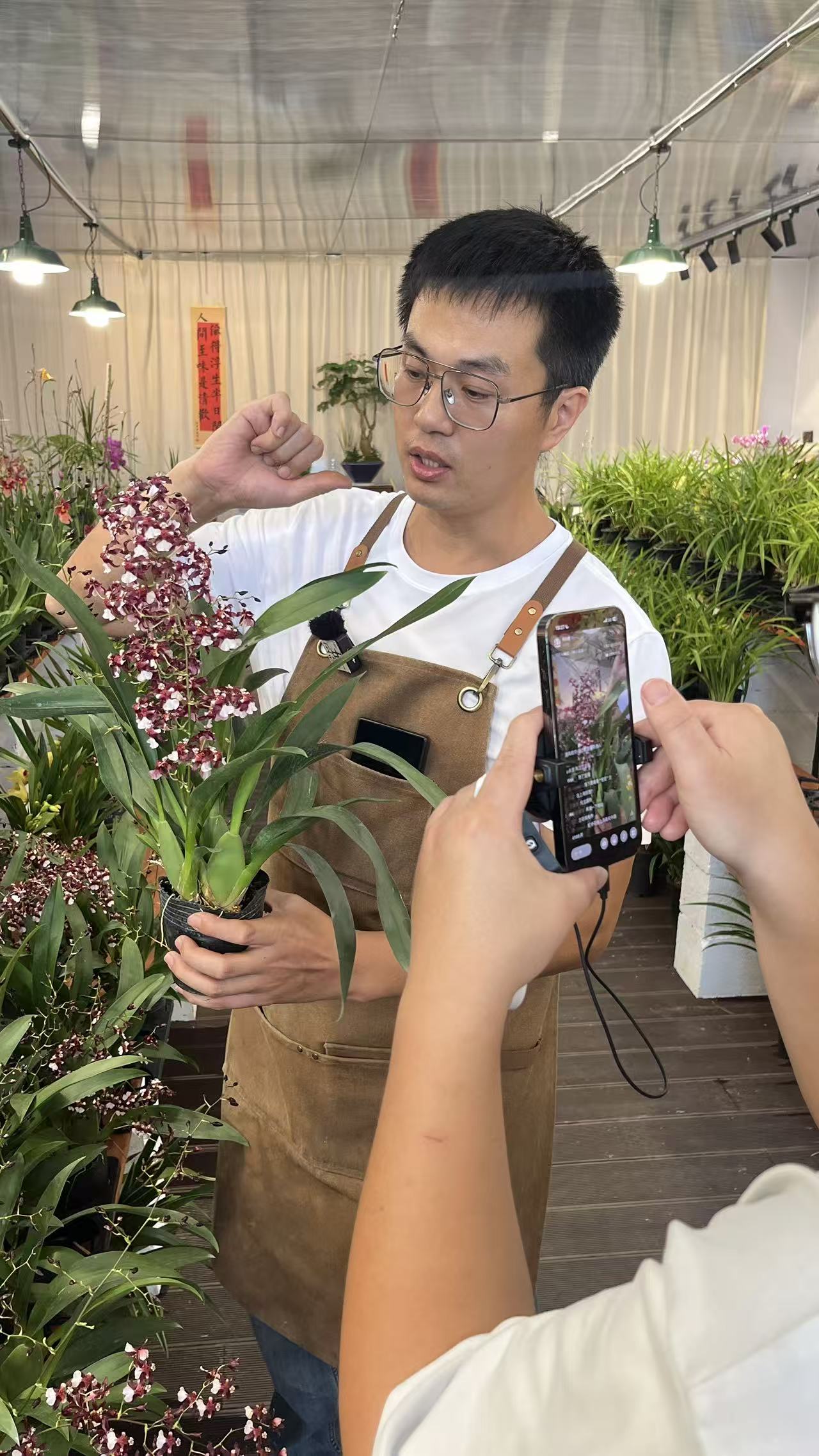 之后,直播团队又和售卖兜兰等花卉的主理人常江聊了聊,他所经营的兰花更偏精致和文艺,同时在造型上也更有美学上的考量。和他采访过程中,记者才知道,这位花店主理人投身花艺20多年,之前竟是一名学习机械设计的学生。他告诉记者,从2002年进入花艺行业,他的最大动力就是对于花卉的热爱,被花卉的魅力所打动。