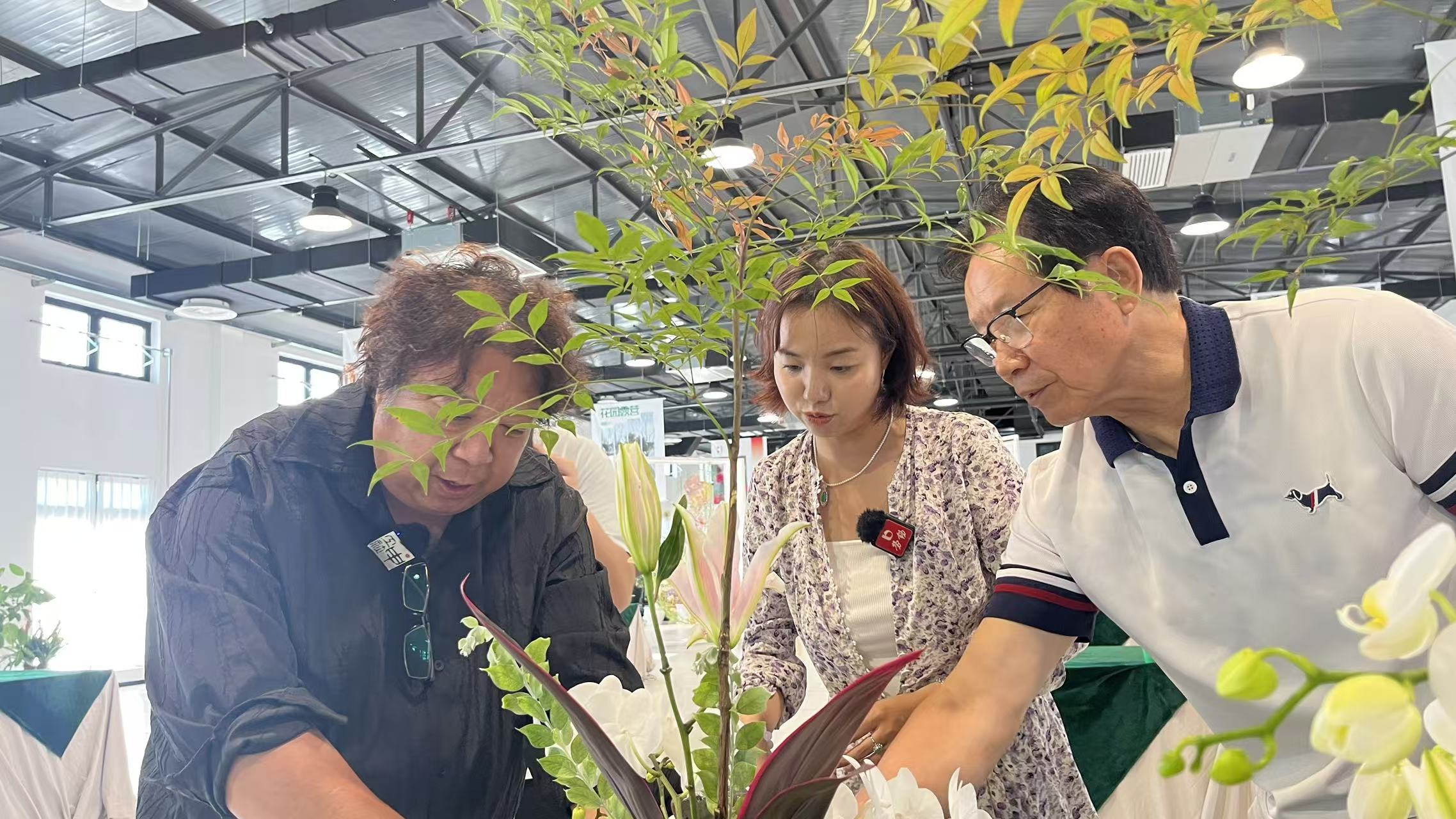 王路昌大师,今年已经81岁,从事插花60多年,谢明老师则是他的徒弟,两人都是首批国家级花艺大师,如今亦师亦友。现场,两位大师手把手地教授主播如何快速地完成一件具有江南韵味的插花作品。