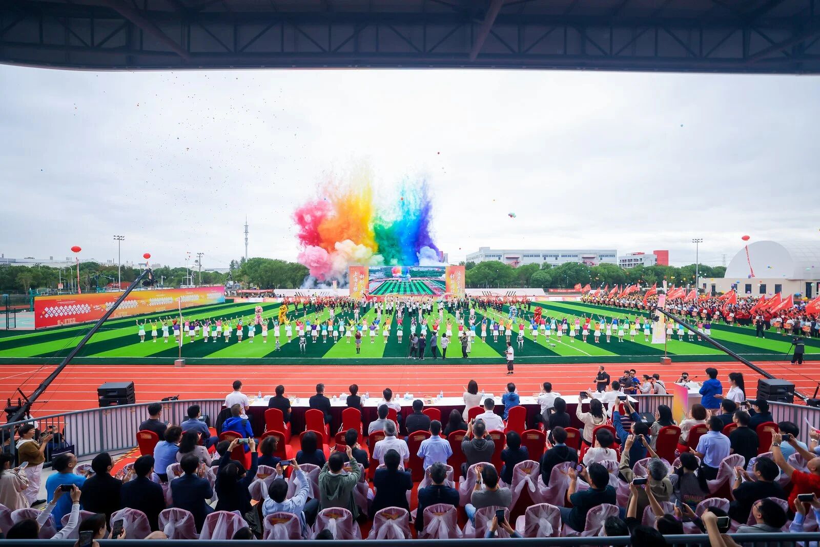 当“国家级松江经济技术开发区首届运动会开幕”的宣告响起,现场氛围热烈高涨。彩烟腾空而起,万千气球同步放飞。绚丽的彩烟与飞舞的气球在天空交织,恰似科技与人文、激情与梦想在这片土地上碰撞融合,将开幕式氛围推向高潮。