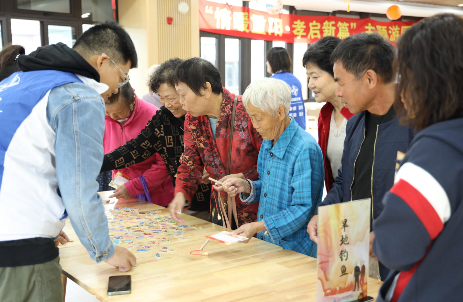 作为游园会的“暖心第一站”,“快乐打卡”摊位前早早便排起了队。海外事业部与上海交建公司的志愿者耐心地为每位长者递上宣传册和打卡材料,长者们或认真挑选角度,或与亲友合影,将节日的喜悦通过朋友圈传递出去。