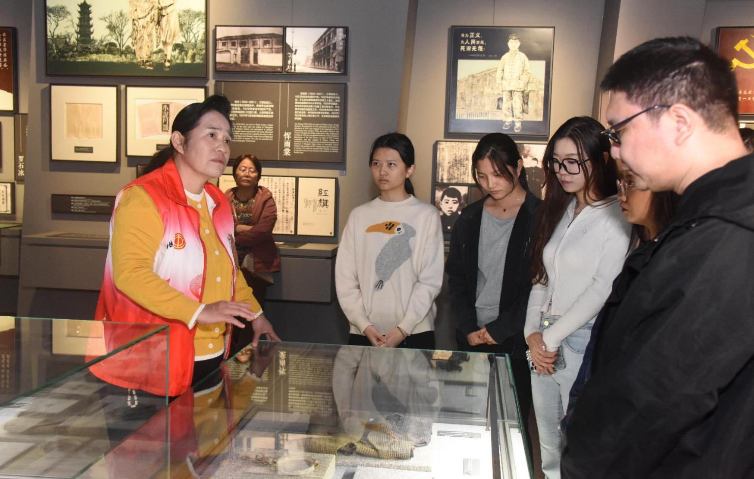 前来交流学习的嘉定区烈士陵园的讲解员们在全国劳模苏嵘、李雷惊、冯知洋,市五一奖章获得者兰凡、区劳模陈俊峭,学生和工会志愿者们的带领讲解下,重温龙华英烈的故事,也深入了解了波澜壮阔的工运历史。嘉定区革命烈士陵园讲解员沈瑜说道:“没想到徐汇的劳模先进和学生志愿者讲解这么专业,还有英雄夫妇的情景演绎令人动容,我们从他们的身上感悟到了新时代的劳模精神和志愿精神,要向他们学习!”