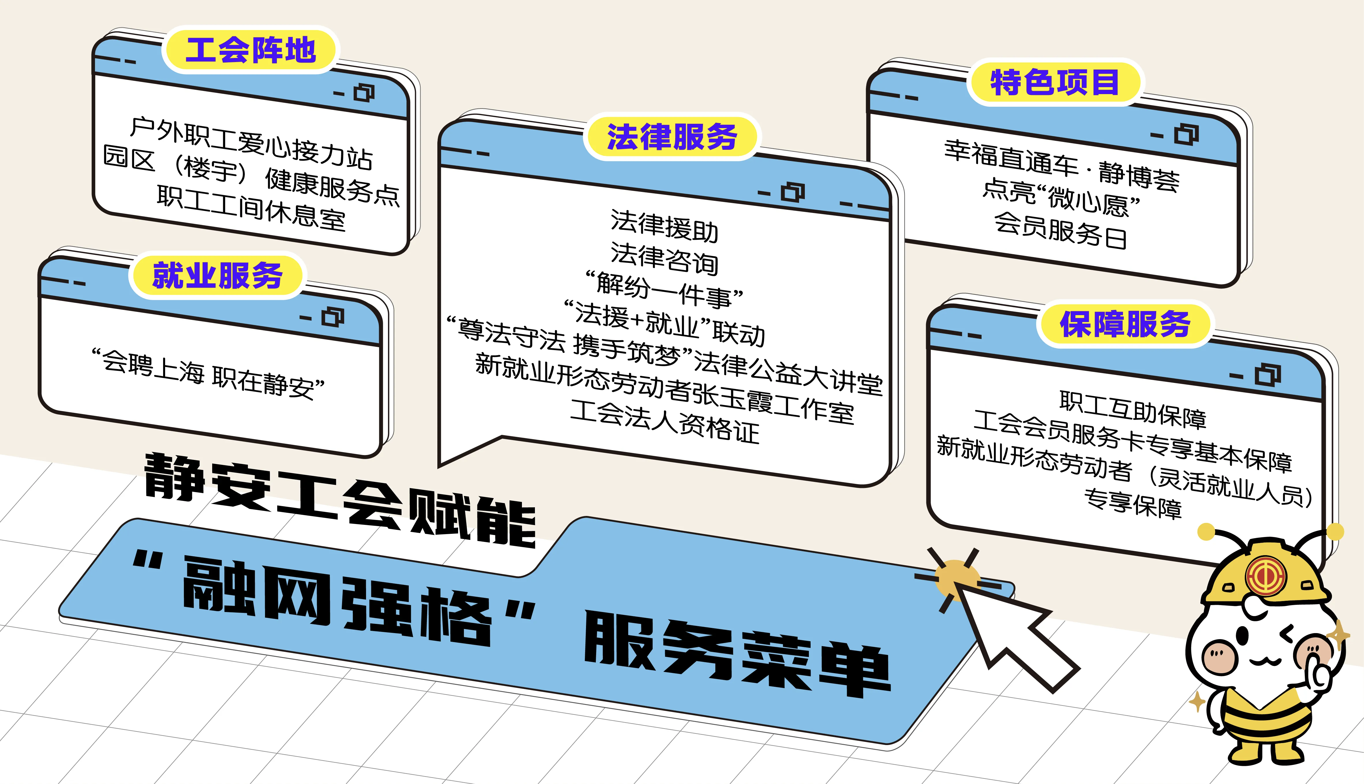 在全区党建引领“多格合一”框架下,静安区总工会以网格为落脚点,深化新兴领域工会组建,推动服务下沉一线。当天,三重工会服务暖心礼同步“沉网入格”:发布整合近20项资源的“融网强格”服务菜单,为企业职工提供“工具箱”式支持;启动“静安建会企业首次参保职工互助保障补贴”,区总工会计划三年补贴256.5万元,覆盖1.5万名职工;“如愿公益助力团”捐赠行李箱、血压仪等物资,点亮新就业形态劳动者“微心愿”。