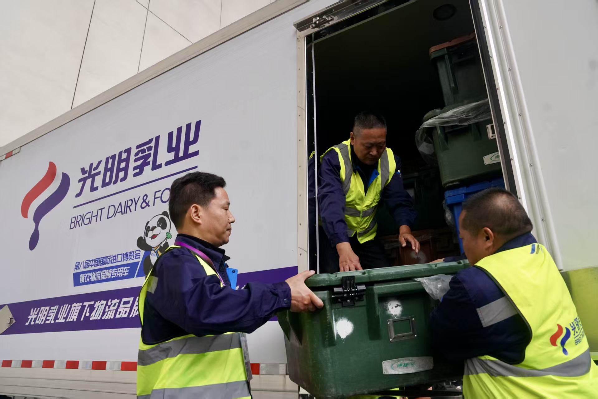 11月6日一早,国家会展中心外已经有了动静,车辆启动的声音悄悄打破了清晨的宁静。远远望去,一群穿着整齐制服的人正围着冷链物流车辆忙前忙后——他们是光明领鲜物流“进博服务突击队”的成员。一旁,一辆商务车静静停靠,这便是突击队的“移动指挥中心”。整整八年,这支“全国工人先锋号”荣誉班组,肩负着场馆工作人员的餐食配送重任,用责任扛起每一餐的“新鲜与安心”。