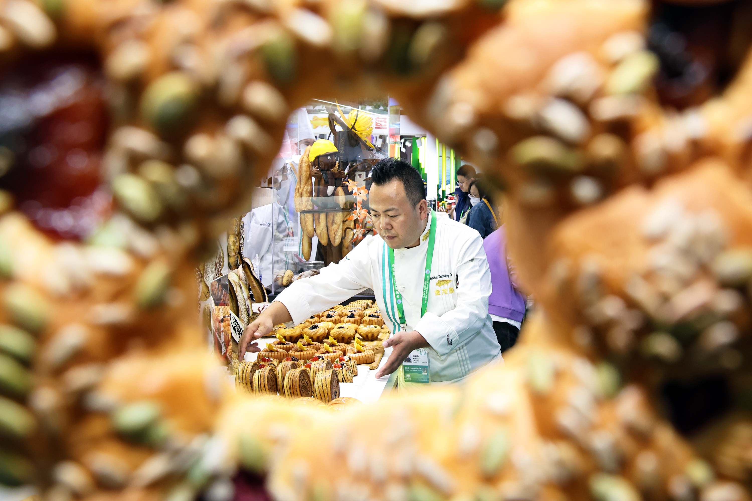 刚一开展,第八届进博会食品展区开始热闹起来。在益海嘉里展台,一个高达1.2米的“匠心”面包墙格外引人注目。这不仅是展品,更是虹口工匠、烘焙研发技术经理张政海在本届进博会上最核心的“工位”。