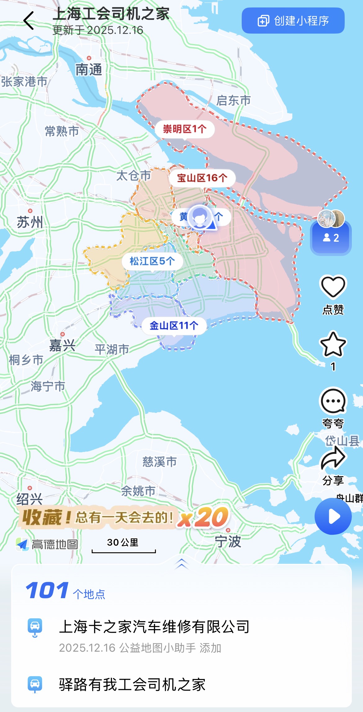 就在上周,网约车、出租车司机、货车司机常用的高德地图上线了全新的功能。只要搜索“上海工会司机之家”,全市101个服务司机师傅们的站点就会显示在地图上,司机可以点击就近站点,查询可以提供哪些服务,如停车位数、充电、饮水、餐饮、洗澡等。