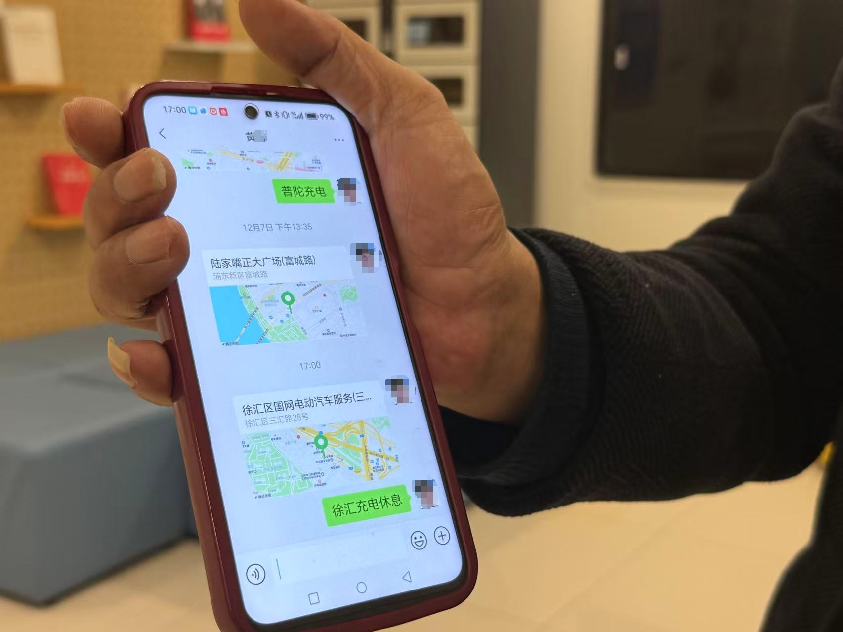 另外一位网约车司机黄师傅则是第一次来这里,他告诉记者,这里充电便宜、休息设施也完备。说完,他打开微信,给自己的账号发了一个定位,备注上“徐汇充电休息”。记者瞥见他的聊天记录,原来,每当遇到一个合心意的充电场所,他都会用这种方式标记下来,方便日后直接导航返回。