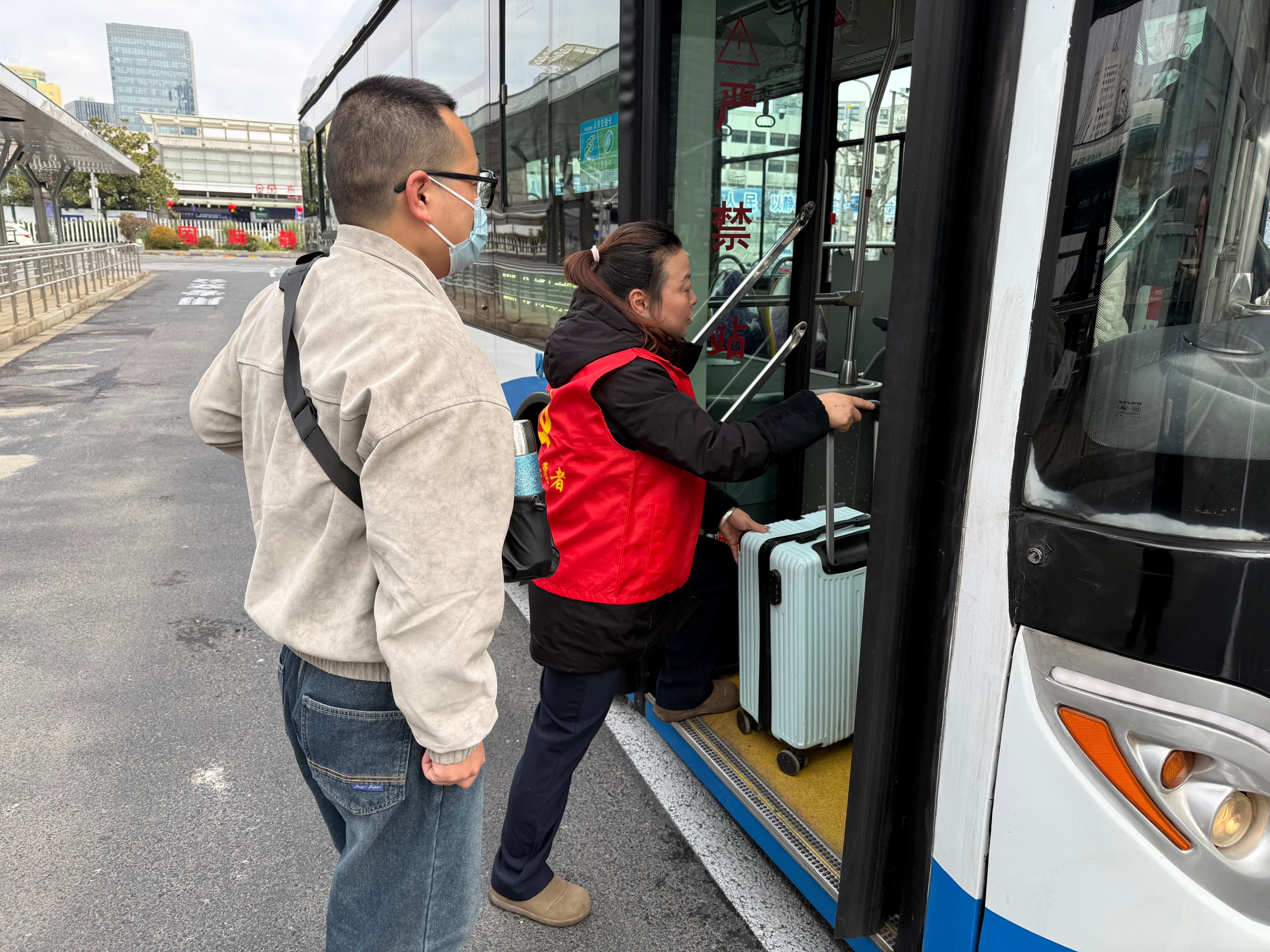 “这辆公交车是去浦东机场的!”,在上海南站(南广场)站,上南公交的志愿者为乘坐机场七线的乘客搬运大件行李,让乘客的出行更加便捷、舒心。