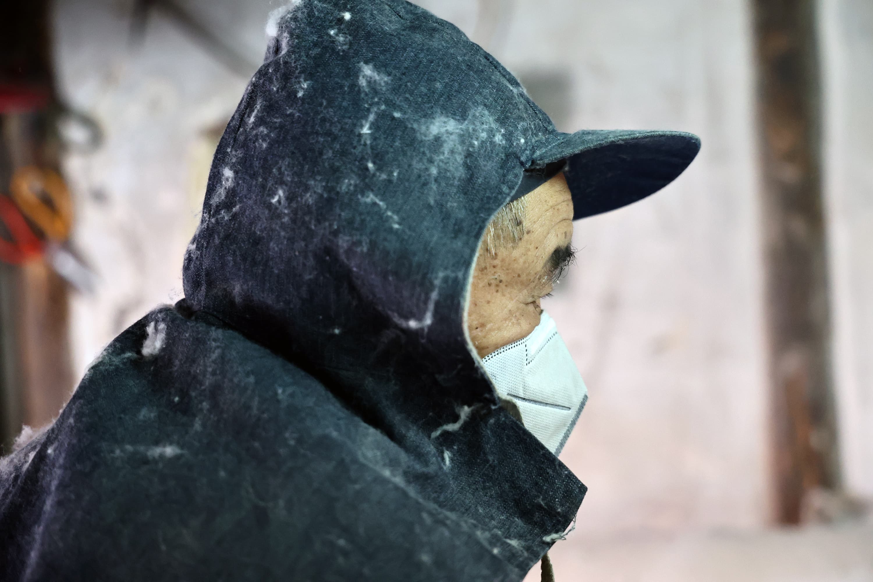 时光倒流回1960年。11岁的潘志同为了生计,跟着师父学习弹棉花。那时的工具还是一把重达11斤的木质大弓,学徒需要将它背在身后,用木锤敲击弓弦,让棉花在“嘭嘭”的闷响中逐渐松软。“那才是真正的力气活,”潘师傅回忆道,那时候在老家温州,“学一门手艺要3年。”学艺期间,他跟着师父四处上门帮人弹棉花,边干边学。学成后,他入伍参军,在北方待了8年。