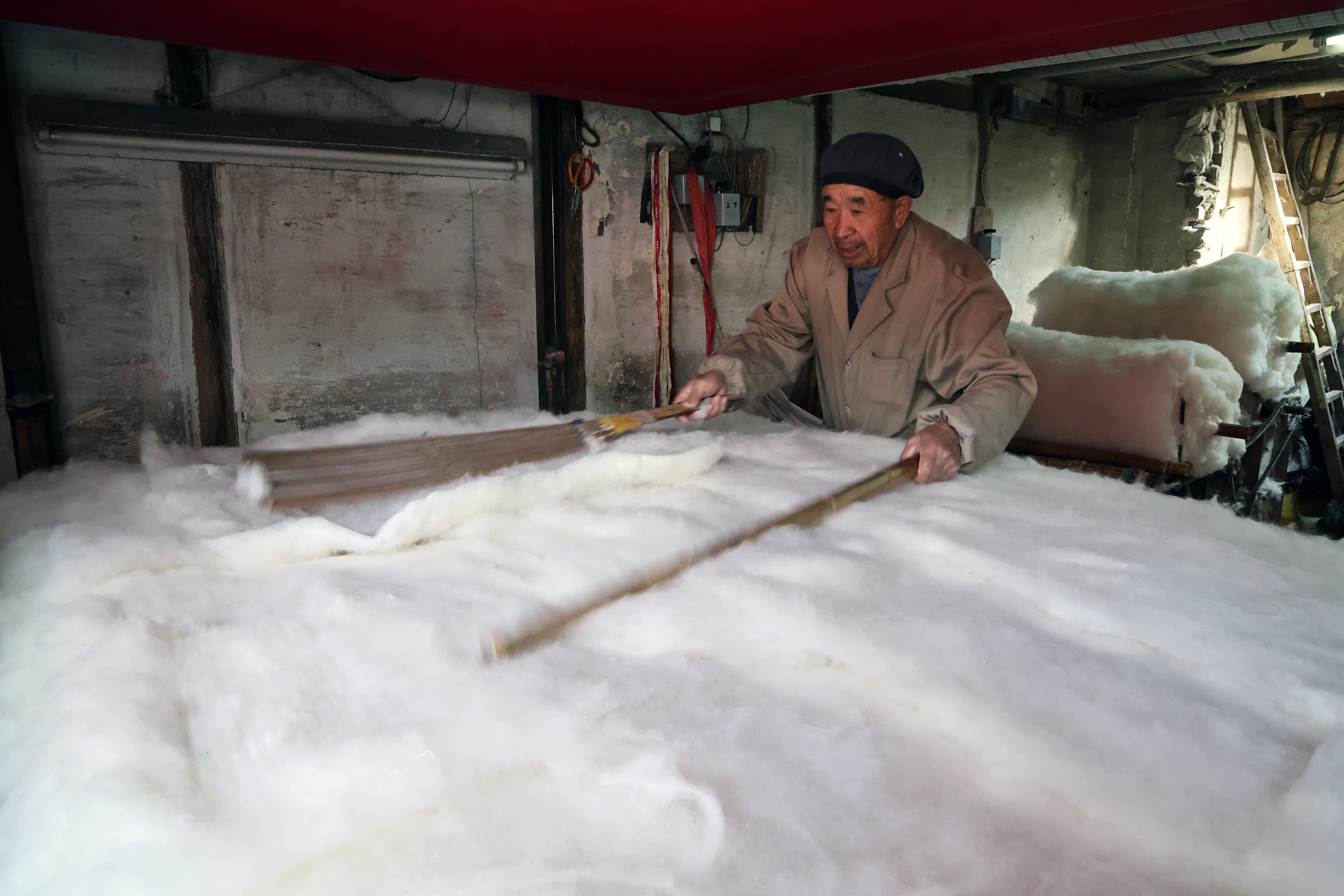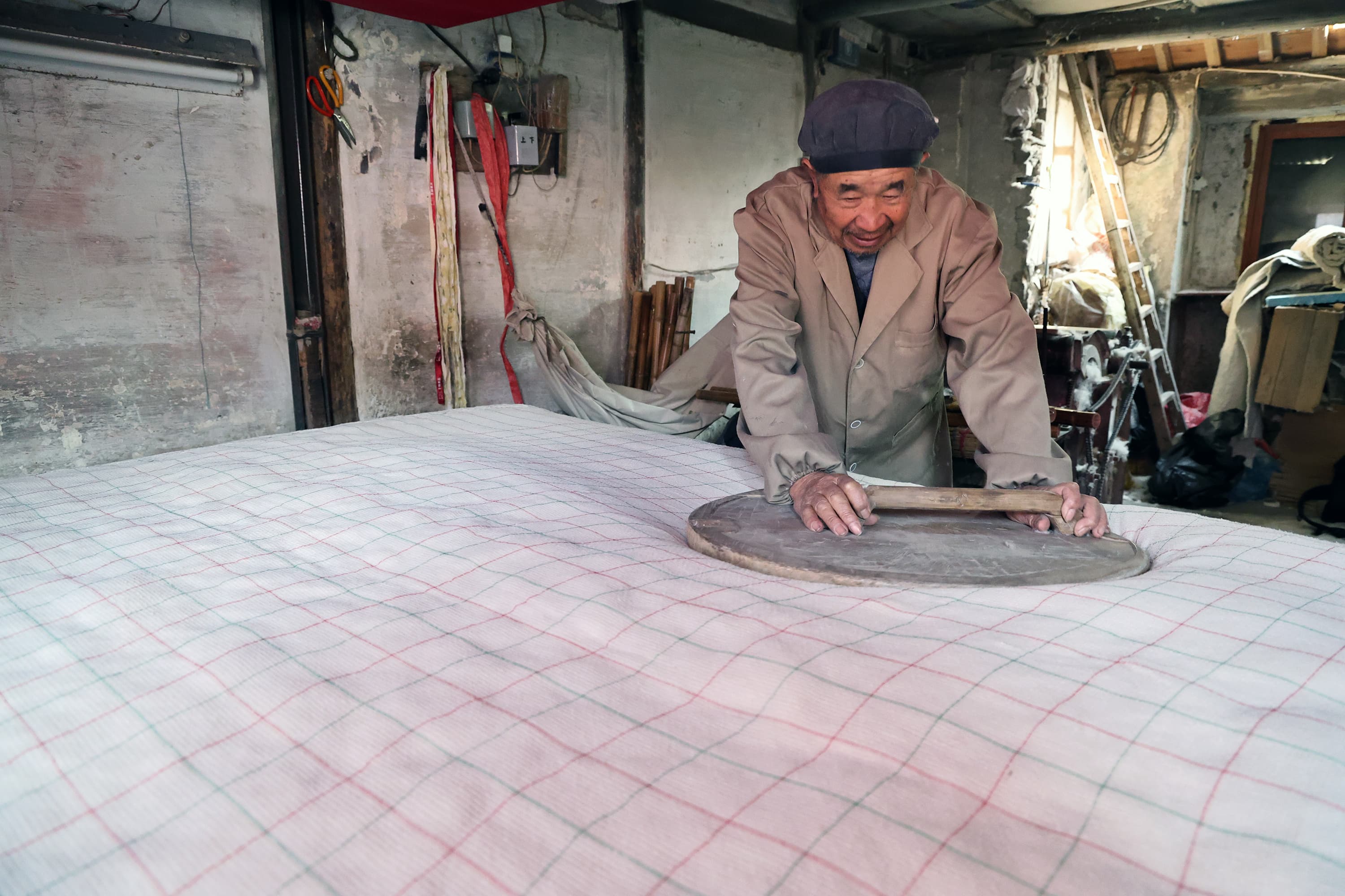 下午四点,阳光变得温和。潘师傅收拾好工具,准备关门。今天又完成了好几床被褥的加工。这些由新棉或旧絮翻新而成的被芯,将带着阳光的味道和手工的温度,走进一个个家庭,抵御冬夜的寒冷。