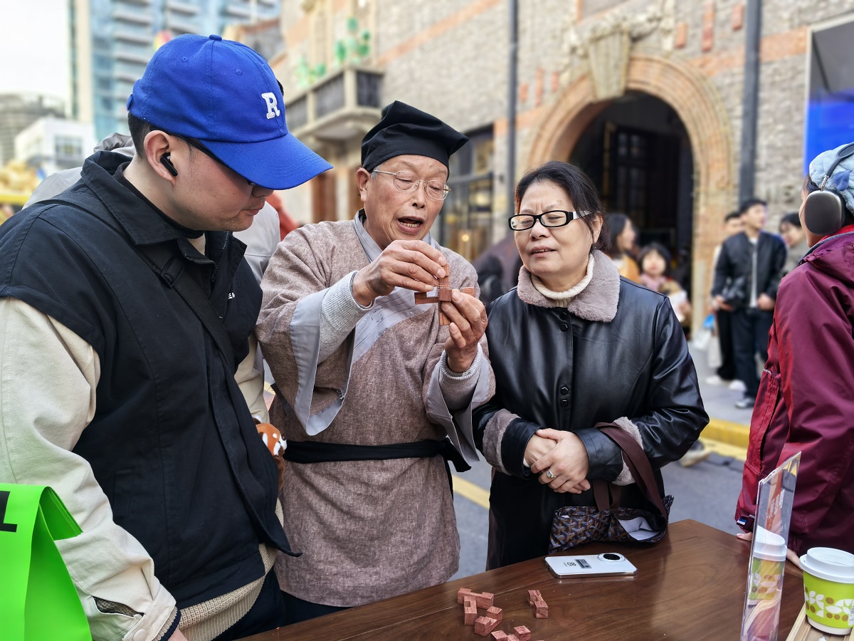 在《藏海传》展位,除了榫卯木马,顾惠明还带来了古建筑模型、鲁班锁以及微缩传统纺织工具、农具等作品。许多年轻观众在体验装置后,对榫卯结构产生浓厚兴趣。顾惠明也乐于借此机会,蹲在展台前耐心讲解这些“木头里的密码”,让更多人了解中国传统建筑与木作技艺的智慧。