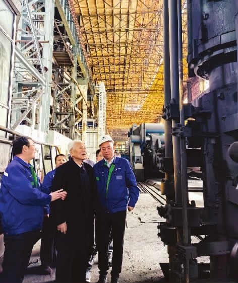 林宗棠在百岁生日当天重访万吨水压机,关切询问设备运转与使用状况。