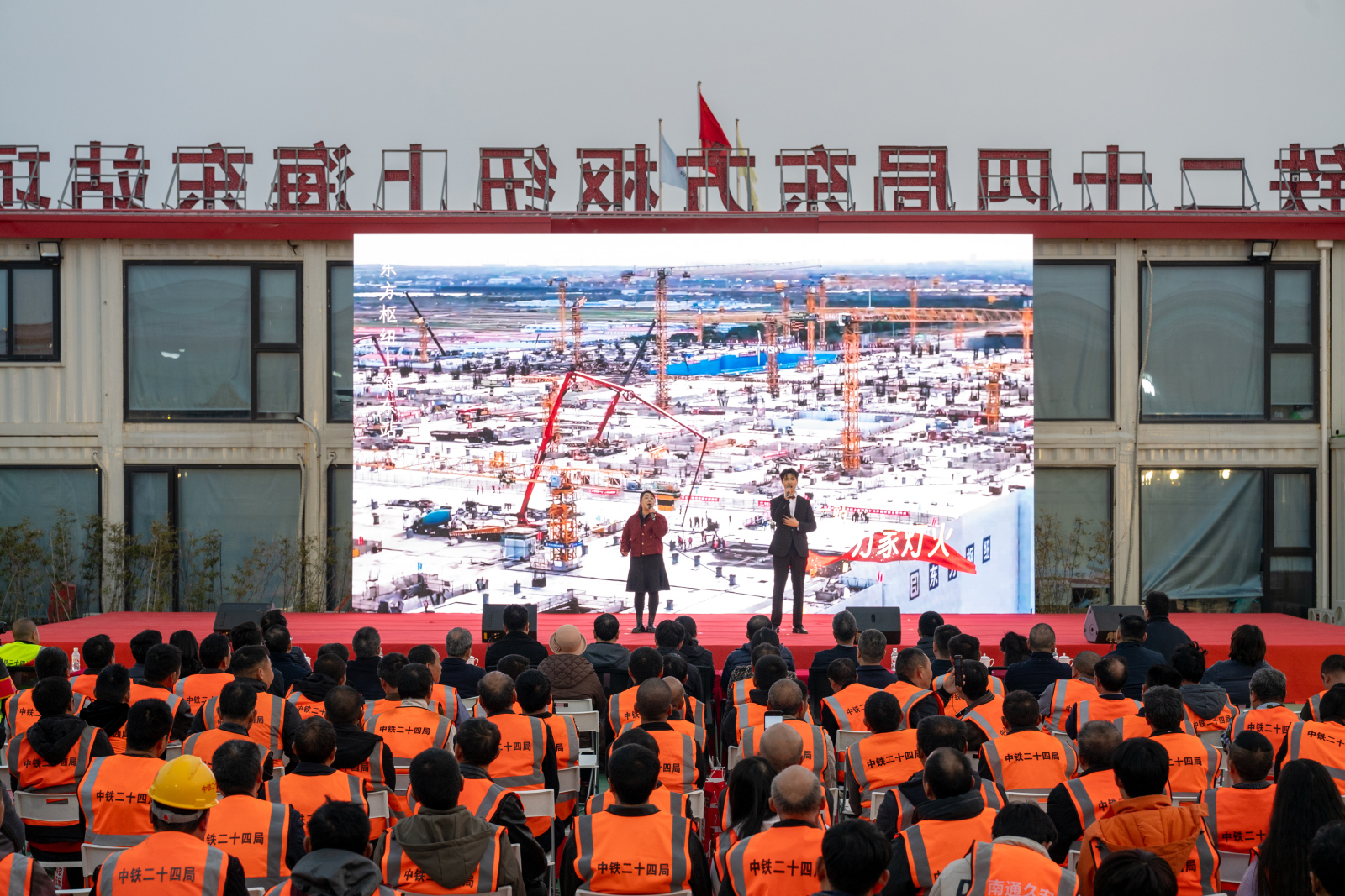 3月19日,由中铁二十四局集团有限公司主办的“幸福二十四 出彩铁建人”文艺进工地活动,在东方枢纽上海东站项目部精彩上演。来自工程建设一线的300余名建设者齐聚一堂,共享这场由职工携手产业工人、监理、辖区派出所带来的文艺演出。