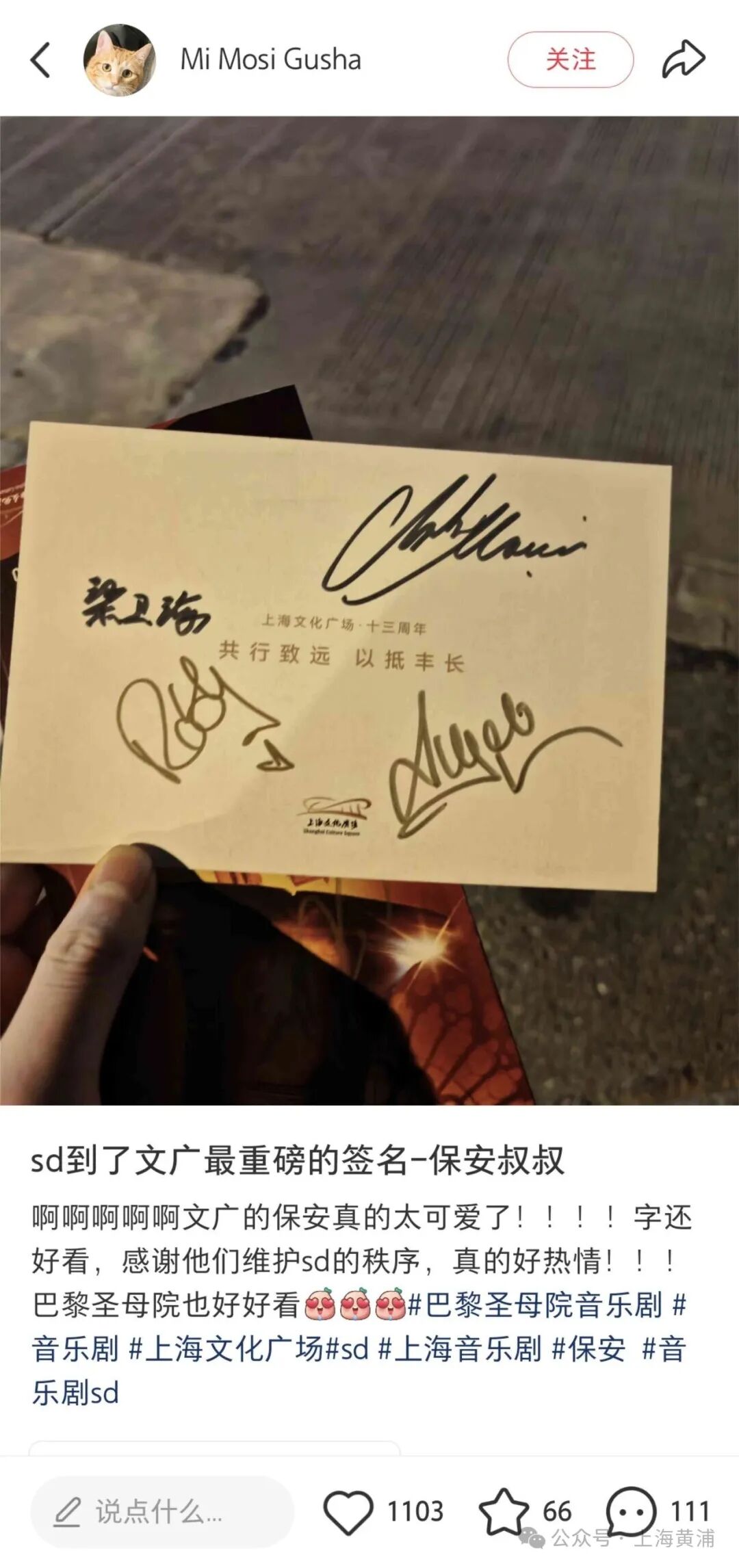 最近,小红书上有一则帖子特别火,在上海文化广场四号门等待音乐剧《巴黎圣母院》主创签名的粉丝晒出了她的“战绩”,一枚负责维持秩序保安叔叔的签名。这枚签名和音乐剧主创的名字在一起,保安也成了粉丝心中的“大明星”。
