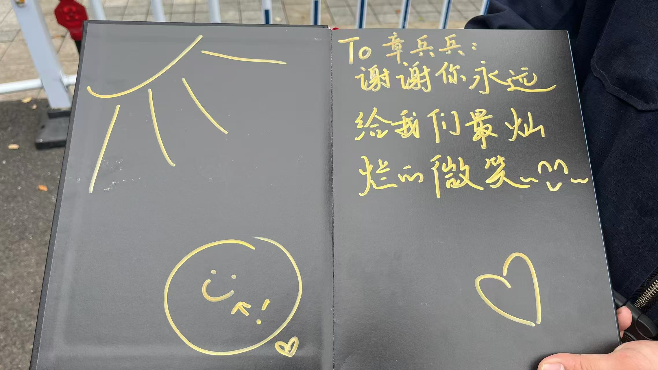 接受采访时,章兵兵透露,他有一本其他人都没有的珍藏演出本。“那是之前音乐剧《莫扎特!》全部主演给我签的名。”章兵兵特意拿出这本演出册,扉页上写着“TO兵兵,谢谢你永远给我们最灿烂的微笑。”而在演员信息那页里,每一位演员不但签了名,还在上面写下wonderful smile!记者了解到,章兵兵在剧目三周多的演出时间里,每天都会在进口处和演员微笑招呼。SD的时候他也陪着主创一起,当礼物越来越多,演员们手里拿不下去的时候,他就帮忙捧着,粉丝够不到的本子,他也帮忙传递,4号门是他工作时间最长的地方。经常在晚上十点演出结束后,他还要和安保的同事们一起,等待全部SD完成后,再结束一天的工作。