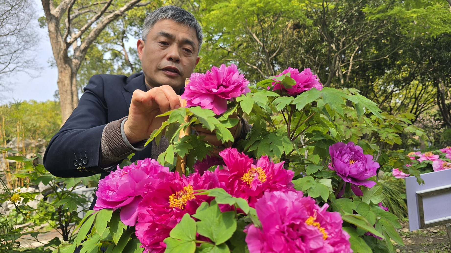 记者注意到,牡丹周围立着一圈新扎的竹竿。朱权说,这是3月底刚做的“加固手术”。“枝条老了,风一吹就晃。花开后更沉,容易断枝。撑起来既保树形,也防落花。”他每天上班要来看三遍,早上看叶片精神,中午看日照,下班前再看一眼有没有病虫害。“清明前后最操心,游客多了,怕人碰着,也怕天气突变。”