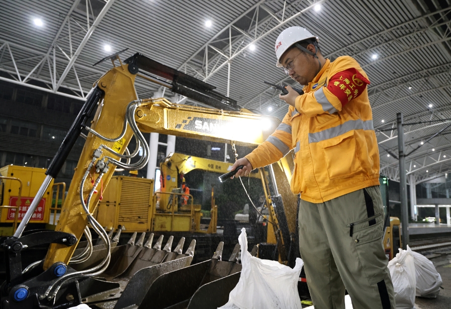 上海站是京沪、沪宁城际等多条线路的交汇枢纽,人流车流量大,车站股道道床历经近40年的高负荷使用,已经出现翻浆冒泥、排水不畅、轨道线性不良等病害,若不加以整修,将影响线路安全。记者在现场看到,股道上,施工人员分工明确,有的在松卸轨枕扣件,有的在专注操作换枕机,还有的在推动平板车回收废弃的石砟,一片热火朝天景象。站台上,菅凌峰一手拿着施工图纸,一手拿着强光手电,来回踱步紧盯施工质量,确保枕轨更换工作在当天220分钟的天窗期内高效、精准完成。“股道和站台间的空间十分有限,工人操作机械臂完成挖砟、取枕、换枕等工序,要十分小心,否则就有可能损坏车站的设施设备,影响后续运行。”