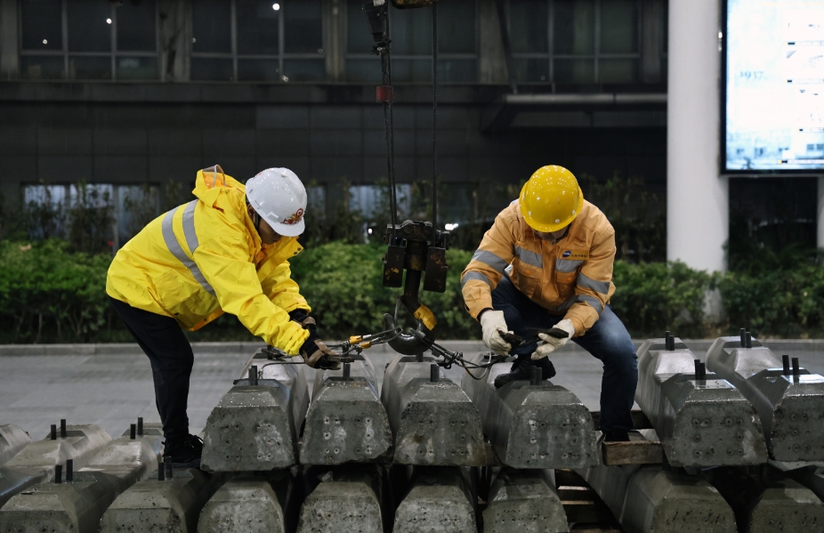 4月14日0时20分,墨黑的天空淅淅沥沥下起了中雨。随着一声“调度命令已下达,可以上道作业”的指令发出,原本安静的上海站瞬间热闹了起来:2道和IX道两根股道上的10台机械设备隆隆作响,70余名工人在道床上紧张忙碌。这是上海站1987年建站至今,首次开展的宽枕板更换整治施工。“我们利用91个施工‘天窗’,将车站13条股道近万根宽枕板更换为IIIa型混凝土枕。”国铁上海局上海工务段上海线路车间副主任菅凌峰告诉记者。