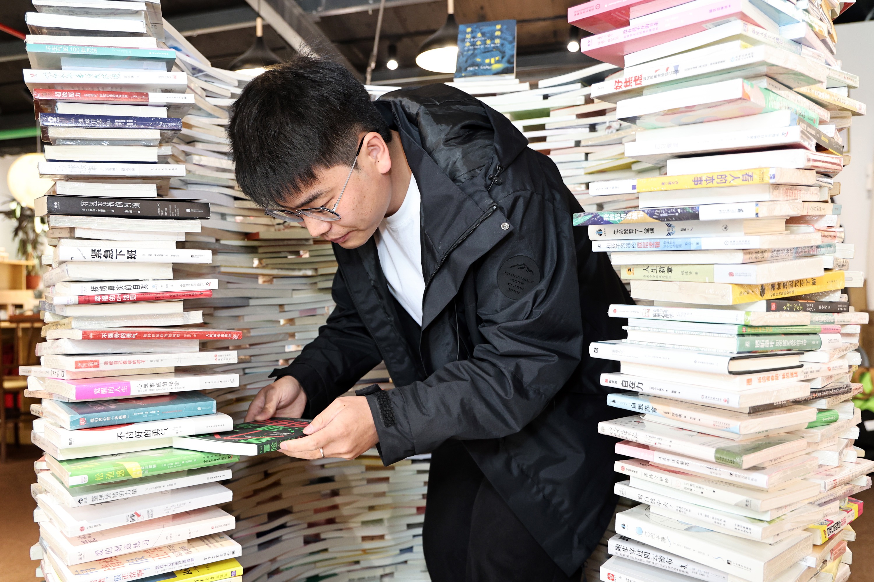 在长宁一家创意园区里,24小时开放的沉潜书屋在今年3月正式营业。书屋的主理人是来自河南新乡的95后小伙张冠昌,但就在一年多前,他开设的第一家书屋因无法维系高昂的店面成本无奈关闭。从2022年7月,在中山公园的八角亭里开设了第一期的书友会到此后“流浪”在各个咖啡店里的读书活动,沉潜书屋一路漂泊。曾经历关停,如今终于收获稳定的店面和热情的书友,张冠昌说,他身边有着一群“天使”。“经常来参加我们活动的一位书友,每个月都会固定给我们打一千块钱,他还给我们捐赠了许多书籍,真心感谢每一位资助书屋的朋友们。”如今,张冠昌和他的女友一起经营着这家24小时的书屋,虽然装修简单,但在入口处,放着他们亲手堆起的“书塔”。千本书构成,一人高,围成一个圈,他在里面进出摆放,这样的状态恰似他这数年来,和阅读之间复杂而亲密的连接。