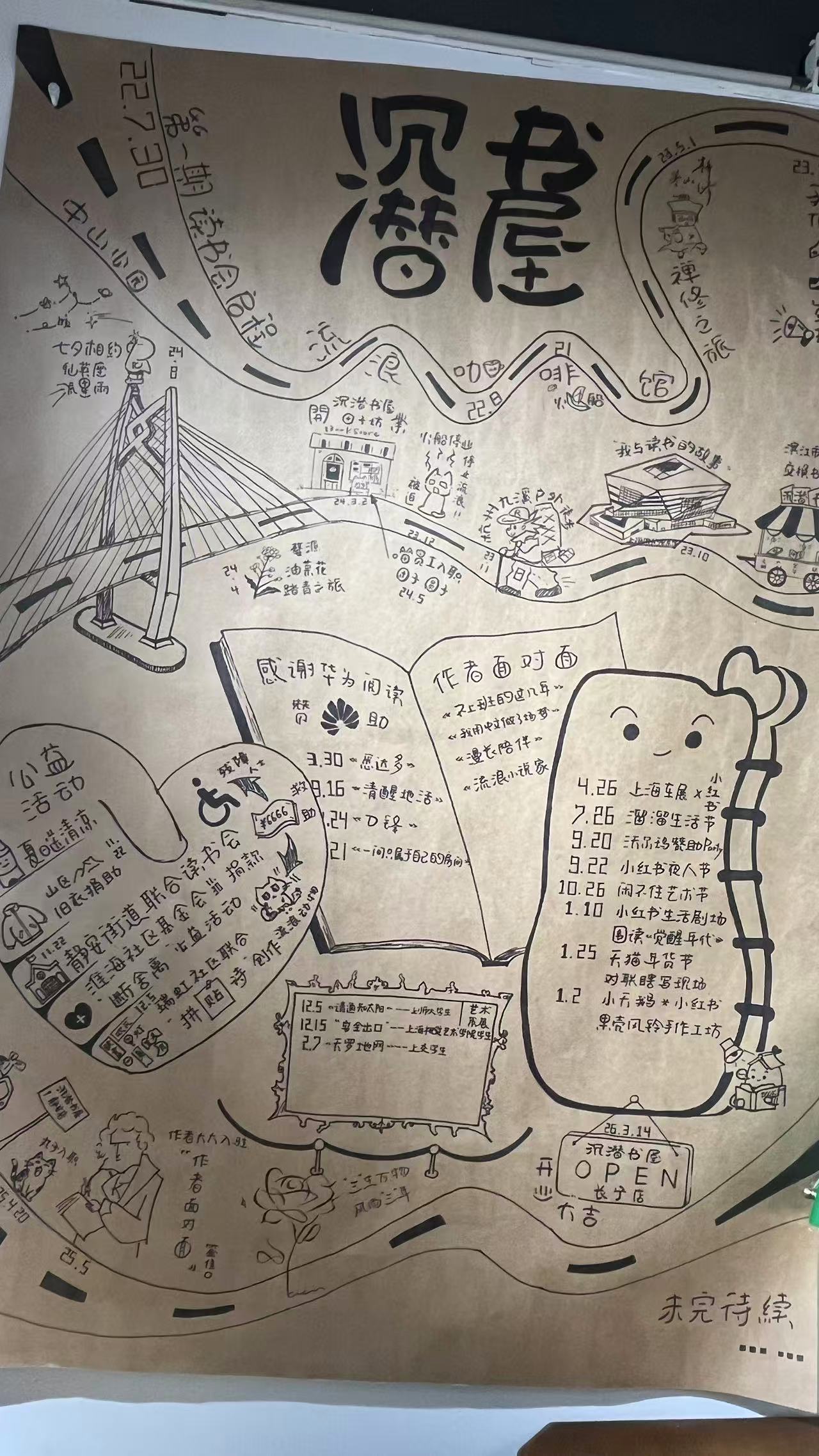 在中山公园的那次读书会,有九个人参加,其中有五位,时至今日一直参与沉潜书屋的各类活动。沉潜书屋的墙上,挂着一幅书友手绘的“流浪地图”,地图上记录了从中山公园那次读书会,到咖啡馆,再到实体书屋的历程,右下角的“未完待续”则代表着重启的当下。