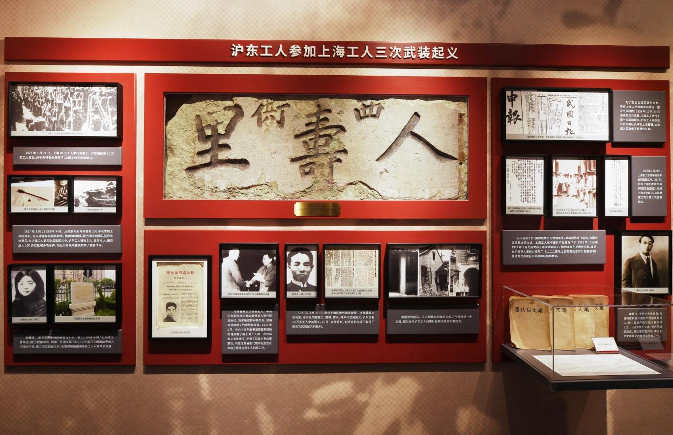 “在这次策展中,最有挑战性的工作便是工运史实物的收集。”上海社科院历史研究所副研究员段炼告诉记者。他也是这次展览的主要策展人之一。他说,展陈中最珍贵的展品当数“人寿里”石匾。1927年3月上海工人第三次武装起义前,沪东工人纠察队曾在人寿里西弄过街楼内进行短期军事训练。这块石匾是人寿里西弄的原物。“当时,杨浦区文保部门得知惠民路地块即将拆迁的线索后,赶忙奔赴现场取回石匾,后一直保存于仓库之中。文保部门听闻筹建了沪东工人运动展示馆的消息后,认为这块石碑十分契合此次展览主题,便将这块珍贵的石匾捐赠给了馆方。”