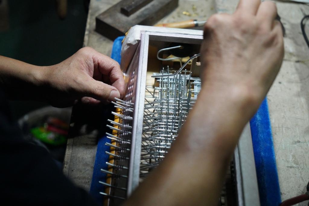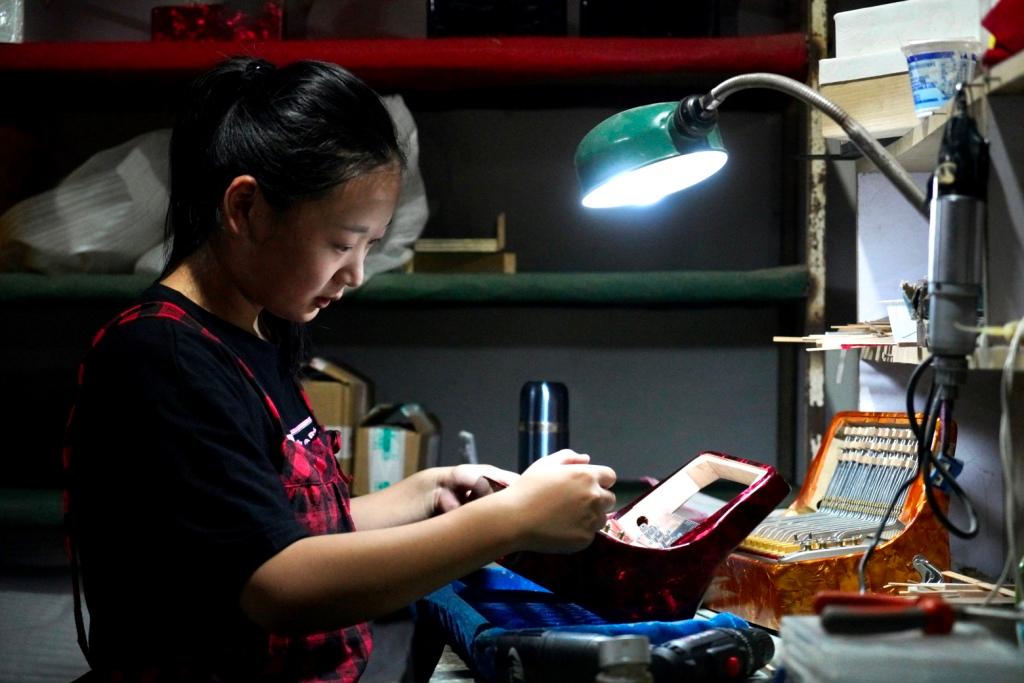 沈健透露,厂里目前最大的业务量就是给意大利、美国、德国的几个品牌供货。“今年疫情,美国的业务蛮受影响,但现在已经逐步复苏了,所以这几天我们也忙起来了。”在三个工作台上,厂里的员工都在忙碌着,每一个人的工序都不同,有的在装配上琴箱、有的在微调簧片结构。