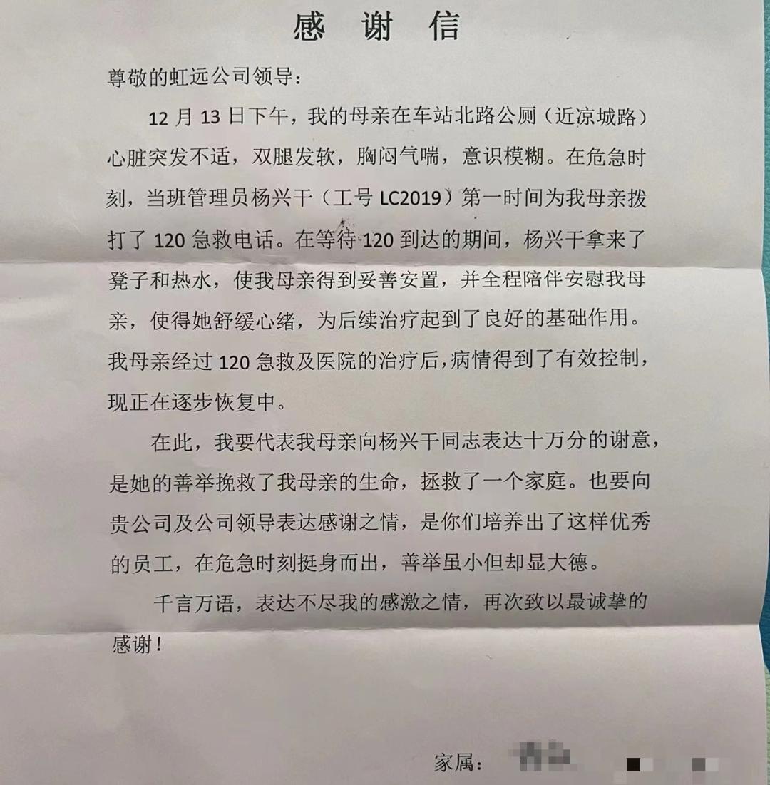为了表示感谢,孙阿姨的女儿向杨兴干所在的虹远公司寄送了感谢信。