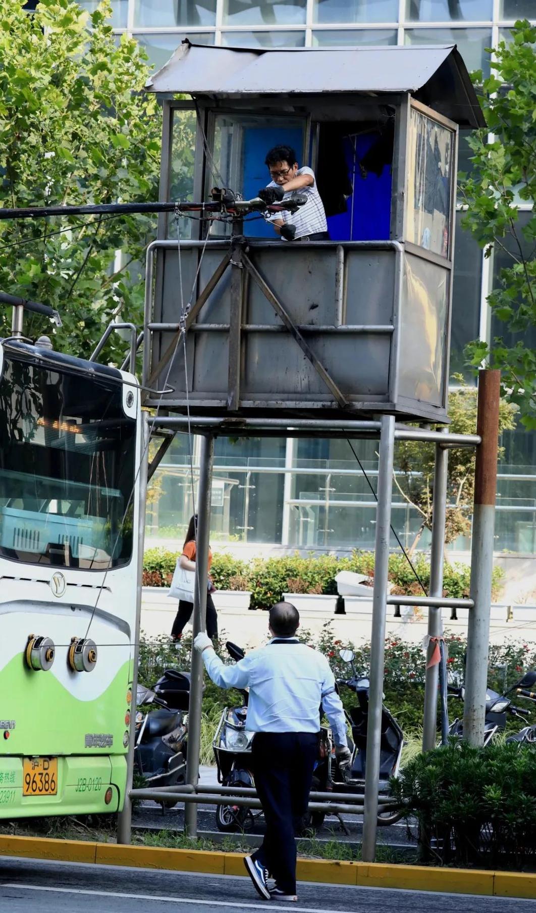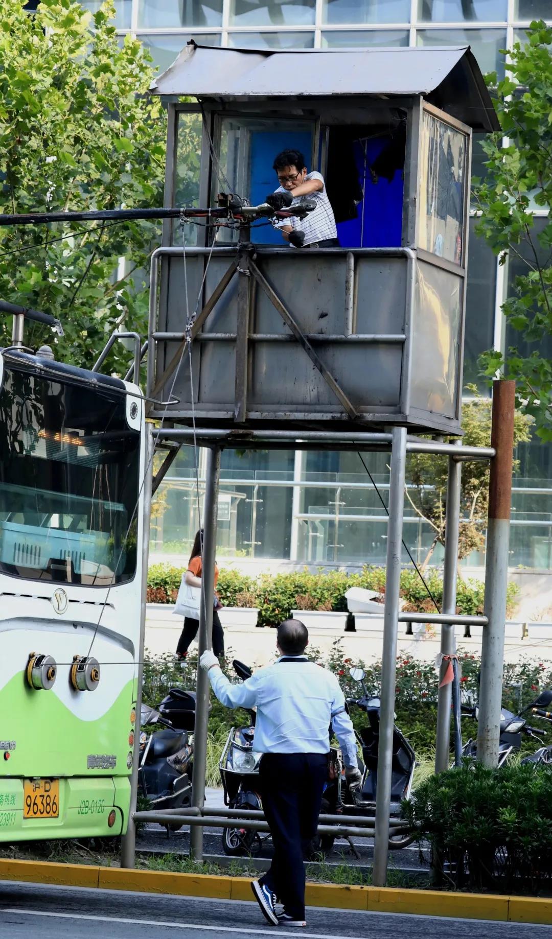 在13路公交车提篮桥终点站旁,有一个由铁皮搭成的小高亭。这个一米见方的小小空间,是巴士一汽十车队技工钱师傅的工作场所,他负责在此检修电车的“小辫子”。每天一大早,钱师傅都会准时爬梯进入小高亭,为停经的每一辆公交车认真检修,一呆就是4个多小时。小高亭里没有任何降温或取暖的设备,炎炎夏日,亭内的温度高达40℃;寒冬腊月,温度常常低至0℃以下。钱师傅一干就是30多年……