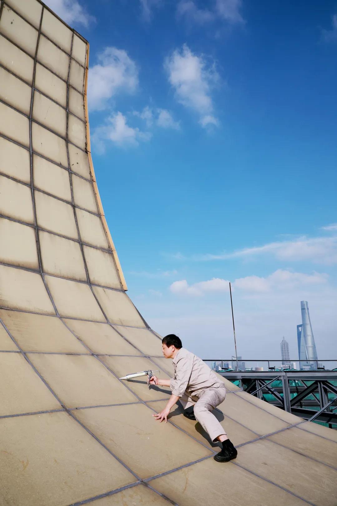 手握硅胶枪,动作娴熟麻利,年近六旬的张庆海正在兰生大厦40楼平台斜坡上做防漏修补。
